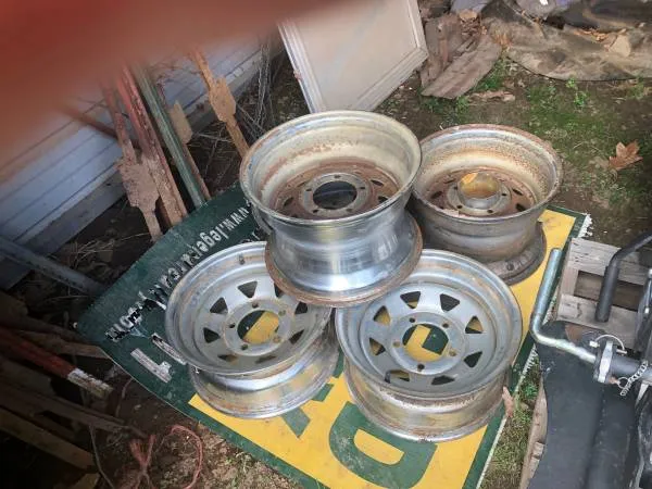 these are 30 dollars each will fit International or some Fords and other brand 4 wheel drives nice aluminum rims sitting at 20106 hwy 45 Cane Hill ar 72717 you can call or text me at 479-530-4264 They are a 51/2 inch spacing between the holes They may be chrome coated I am not absolutely sure