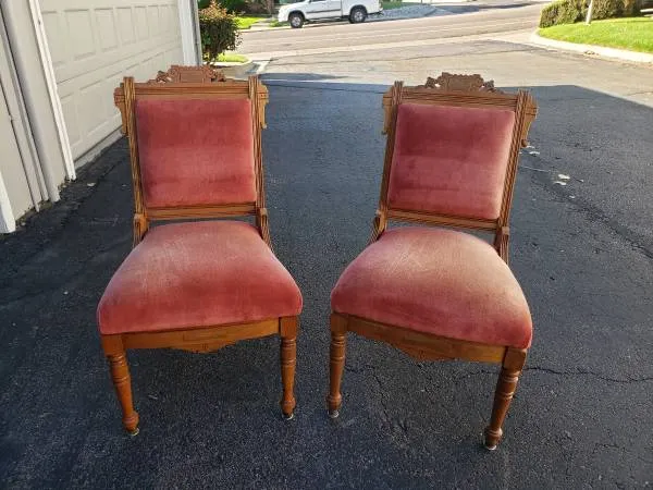 2 vintage/antique hand carved wood walnut dining chairs with pink velvet cushioned seats. *cash only **email or text inquires (Please no calls)