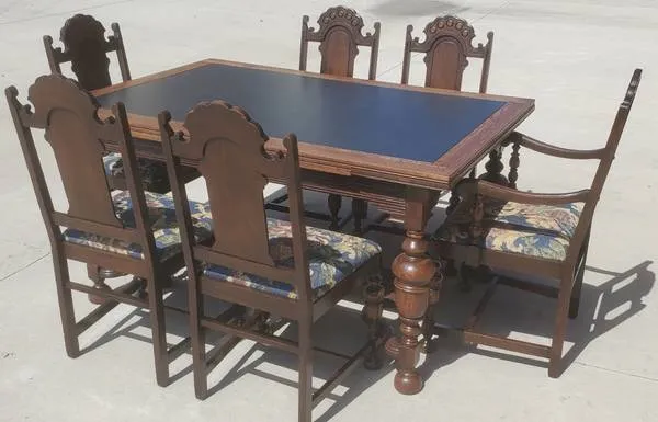 This is a very nice Jacobean style dining room table and chair set that is probably from the 1920 s or 1930 s. The table top has been painted black with the oak wood on the sides have been stained and has several coats of polyurethane for maximum protection. It measures 40 wide by 60 long and is 30.5 high. The 212 leaves on the table pull out and pop up from each end to extend the table to 84 long. The chairs have all be restored and re-glued and are very sturdy. The side chair seats are 19 wide and 19 high. The captains chair seat is 21 wide and 19 high. The arms are 24 wide. This dining set is now ready for a new home. If interested please call Sharon at 719-488-3778 which is a land line number so wont accept texts. I do not respond to emails or texts and I will delete this ad as soon as it is sold. Check out my other listings on the more ads by this user box. Cash Only Please! Thanks for looking!