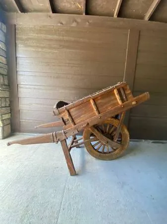 Beautiful large, very old wooden Wheel Barrel. Solid wood wheel & hub, with wood accents & iron embellishments all are indicators of as early as the late 1820 s to 1840 s. Local Pickup. REASONABLE offers considered. Cash Only. Contact Don by TEXT 479-252-0084.