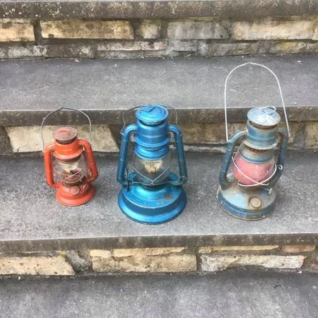 Lot of 3 Barn Railroad lanterns In Great condition cool collectible would make a great camp, cottage, Man Cave, garage, barn , Barn decoration. The one on the right is marked city of New York with Red Globe !! - * if pictures are up then it is Available *CALL ME or check your spam folder. (( Pre-Moving Downsizing Storage deck tote front