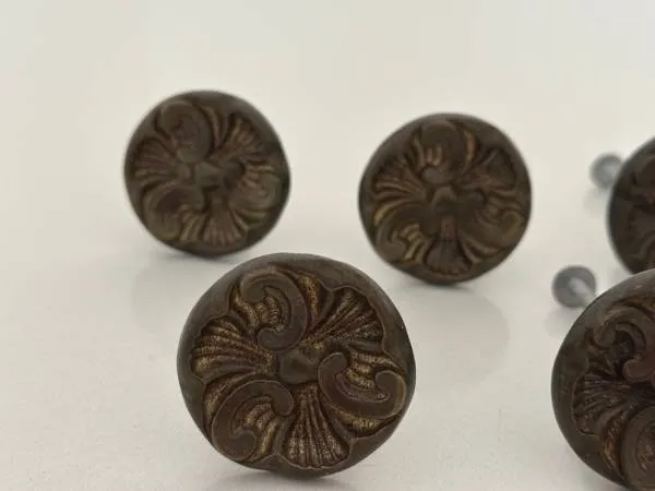 Lot of 8 brass cabinet/ drawer pulls that came out of our 1965 home. Excellent vintage condition. Heavy, fully intact without any chips . Beautiful petal like detail with a slight scalloped edge . 1.5 wide