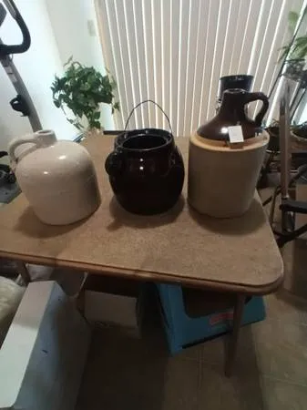 Clearing estate, 1 gal. unmarked Red Wing $15.00, stoneware cooking crock with bale handle $10.00, and one 1800s stoneware dome top as is due to being shot with a BB gun as shown, $7.00. call or text for pickup, six one two -eight zero two -three one nine five, selling to clear estate.