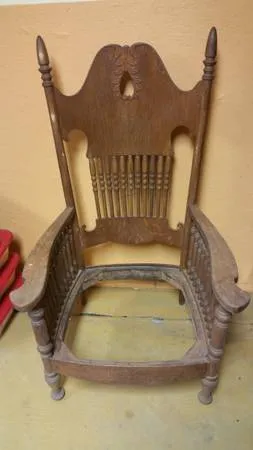 This chair 46 tall to top of finale x 27 W x 22 Dhas been stripped and most of the repairs made. The cushion, not original to chair, with a few tweaks and a new cover could fill the requirement. Cushion to floor h 8 is 15. This, rare find, piece has the potential to be very beautiful and valuable. Please, cash or Postal M 1 y Orders only. Please, serious inquiries only. Contact Patsy at 816-865-1783. Pick Up only. Thanks for your interest.