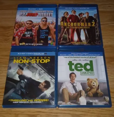 media type: blu-ray Lot 4 Blu ray movie Like New watched 1 time. If you are interested please call or text 971-297-5152. Price: $16.00 22 Jump StreetBlu-ray DVD, 2014, 2-Disc Set Anchorman 2: The Legend ContinuesBlu-ray DVD, 2014, 2-Disc Set Non-StopBlu-ray DVD, 2014, 2-Disc Set TedBlu-ray DVD, 2012, 2-Disc Set