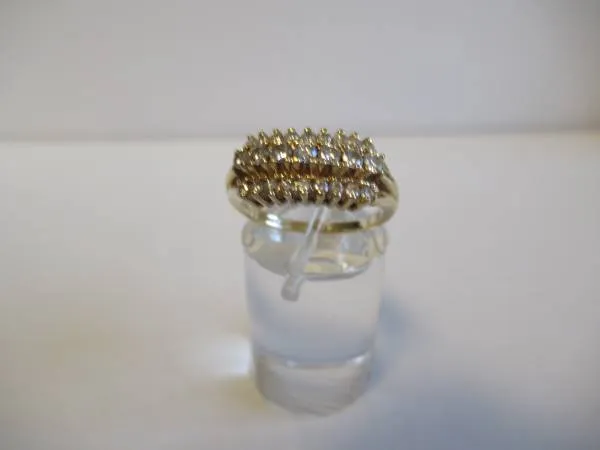 4.14 grams in total weight of yellow gold and Diamonds. The earth mined (not lab created) Diamonds have seven 3.0 mm rounds and eighteen 1.5 mm rounds. This is a family estate piece and Diamond weight is unknown. It is in excellent vintage condition. $500 cash firm. No delivery. You pick up. Leave a phone number with details for a call back.