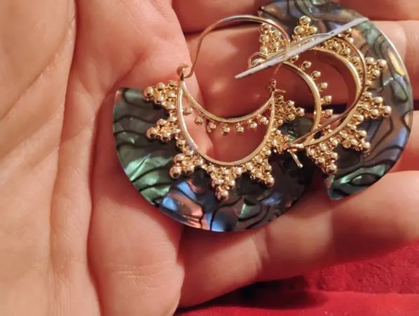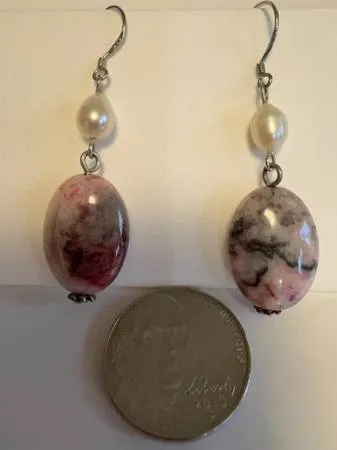White freshwater pearls combined with a mauve color stone or red color stone or aqua color stone or turquoise color stone. Blue freshwater pearl with brown color stone. Bronze freshwater pearl with turquoise color stone. New hook style earrings for $30 each pair or two pair for $50 cash. No delivery. You pick up. Leave a phone number for a call back.