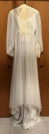 Wedding dress It is vintage (or for clothes...) - we are the antiques! We need to make room and time to share its magic (43 years & counting) Lace & beaded bodice Tulle long sleeves with lace accents Lace back with buttons over zipper Lace accents at waist Lace clips to gather train Excellent (like new?!) vintage condition No size tag Dimensions (laid flat so really 1/2 for arounds) -Waist 12 - Shoulders 17 - Shoulder to floor, front 60 Cash only, you pick up in Edmonds Please include name & phone # and Ill CALL to make arrangements If the ad is up the dress is still available (so please dont email only to ask that) - include # & name love family dance life reception As Is