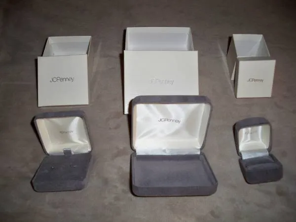 Selling a set of 3 matching empty J C Penney jewelry boxes for $7. The set includes necklace / bracelet, ring, and earring boxes. Outer boxes are in white and inner box in gray velvet-like material. All 3 are in excellent condition. Great way to display or present jewelry! Please email / text / call if interested.....Thanks
