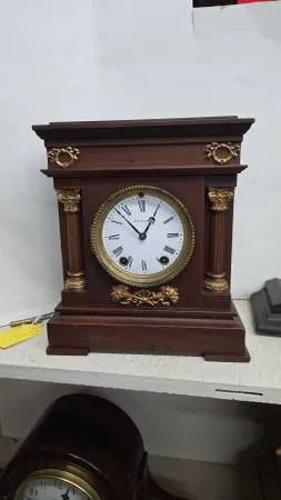 This is an Antique American made Seth Thomas clock. It’s 1 from their 1875-1894 City Clocks” series of clocks model “Cordova” and can be seen in Tran Duy Ly’s “Seth Thomas Clocks & Movements” page 34.see picture It correctly chimes the current number of hours at the top of each hour and once each half hour, on a gong. It has an 8 day movement, which means you just wind it once a week. The glass is cracked. This case measures approximately 10.75 tall by 9.75 wide by 5.5 deep. Clock was serviced. The movement was recently professionally cleanedultra-sonically, oiled, and 14 bushings were added.Over $200 value by itself It keeps excellent time. This clock should be able to run for many years to come, without additional service. Hurry and get it before it’s somebody else gets this bargain first. Don’t miss out on this great bargain! $150 cash only In person Cash, Zelle or Paypal when shippedat buyers expenseonly No shipping outside of the US 916-534-8895