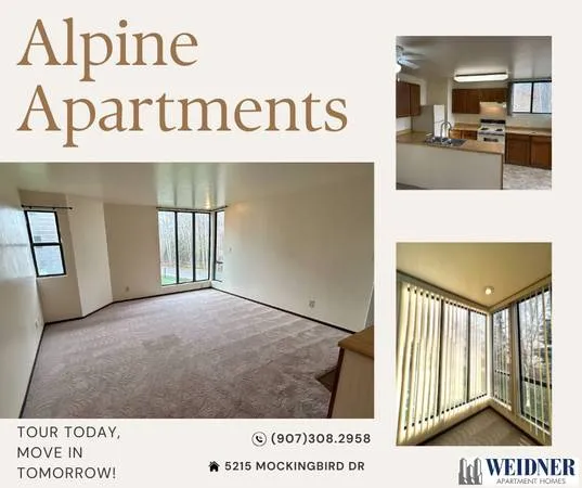 -- Alpine -- Phone: Monthly Rent: $1410 - $1545 Apartment: 1 Bedroom | 1 Bathroom Square Footage: 780 sq ft Welcome home to Alpine Apartments! Located in Midtown, you are minutes away from UAA, Providence, ALASKA Regional Hospital, shopping, downtown, restaurants, and more. Youll love being near Far North Bicentennial Park where your day can be full of multi-use hiking and biking trails, skiing, and relaxing in the garden. You will also love being near Knik Arm where you can enjoy a plethora of your favorite water activities! * Our open floor plans offer large living space and lots of natural light. Let us welcome you home today! Alpine offers interior hallways, 24hr laundry facilities, and a friendly, outgoing on-site staff. Pet Policy: Breed Restriction No Weight Restrictions Please call for more details. Check out our beautiful community featuring: ✓ 24 Hour Availability ✓ Accepts Electronic Payments ✓ Coffee Bar ✓ Dog Park ✓ Elevator ✓ Emergency Maintenance ✓ Fitness Center ✓ Lounge ✓ On-Site Maintenance ✓ Resident-run Garden ✓ Keyed Access ✓ Military Discount ✓ Mountain Views ✓ Night Patrol ✓ Online Maintenance Requests ✓ Online Rent Payment ✓ On-Site Management ✓ Package Receiving ✓ Walking Trails ✓ Wheelchair Access Apartment features include: ✓ Air Conditioning In Select Units ✓ Bay Windows In Select Units ✓ Ceiling Fans ✓ Chugach Mountain & Sleeping Lady Views In Select Units ✓ Dishwasher ✓ Intercom/ Call Box ✓ Kitchen Island ✓ Linen Closet Phone: Mon - FRI: 10:00 AM - 6:00 PM Website: www.lease-apts.com?n=alpine&rp=k6gdndbqsy&t=wb Online Application: www.lease-apts.com?n=alpine&rp=k6gdndbqsy&t=ap 3D Virtual Tour: www.lease-apts.com?n=alpine&rp=k6gdndbqsy&t=trt 5215 Mockingbird Dr Anchorage, AK 99507 Lease Terms: 6-Month, 7-Month, 8-Month, 9-Month, 10-Month, 11-Month, 12-Month Thank you for your interest in making our community your place to call home! Along with our income and credit requirements, we do not automatically exclude rental applicants based on criminal history. Any criminal history will be evaluated in consideration of when the crime occurred, what the underlying conduct entailed and/or what the rental applicant has done since the conviction. We look forward to working with you and please feel free to contact our office or stop by if you have any questions on how to apply. Prices and availability subject to change EQUAL HOUSING OPPORTUNITY 7A9C22D8635E4D
