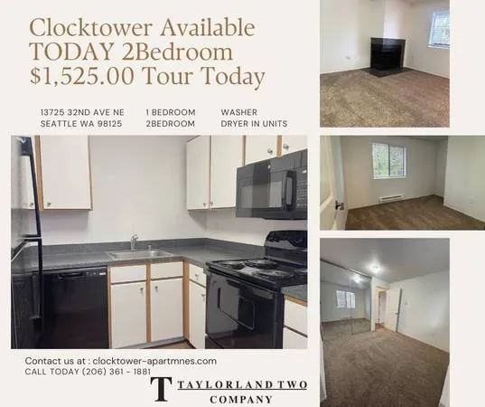 To schedule a tour We now book our tour appointments online! Please call or text us at to self-schedule from your phone! Book your appointment online today or anytime 24/7! Property Description Here at ClockTower, were more than just an apartment complex in Seattle, Washington... were a community that youll be proud to call your home! ClockTower offers 1- and 2-bedroom apartment homes, along with resort-like amenities and a management team that is dedicated to serving you! Welcome Home to ClockTower Apartment Homes! View our 3D Tours by following the s below: https://my.matterport.com/show/?m=FM8cobifJKR https://my.matterport.com/show/?m=fCK6QgFtFn9 https://my.matterport.com/show/?m=X9NDTaVpC6u https://my.matterport.com/show/?m=FFoCtjMVwor Please click the below to view our General Rental Requirements http://www.clocktower-apartments.com/rental-requirements/ Details Pets: Cats Only Pet Deposit: $300.00 Pet Rent: $35.00 per pet Deposit for 1Bd: $300.00 Deposit for 2Bd: $400.00 Application fee: $14.35 per adult Leasing options: 7 - 12 months Amenity Fee - $50.00 (one-time charge at move-in) Amenities Included in Utilities Cost: Utilities Cost: $16/Mo Trash, Water/Sewer price based on Sq. Footage and Occupants Laundry: In Unit Parking Type: Covered Parking notes: $55/month uncovered, $60/month partially covered, and $85/month covered. Appliances: Dishwasher, Refrigerator, Garbage disposal, Microwave, Range/Oven Exterior: Balcony/patio Heating/cooling: Heat: forced air. Wiring: Cable-ready Facilities and Recreation: Shared pool, Fitness center, Clubhouse, Barbecue, Business center Security and Access: Elevator, Controlled access, Gated entry, Disability Access Offered by: ClockTower Equal Housing Opportunity