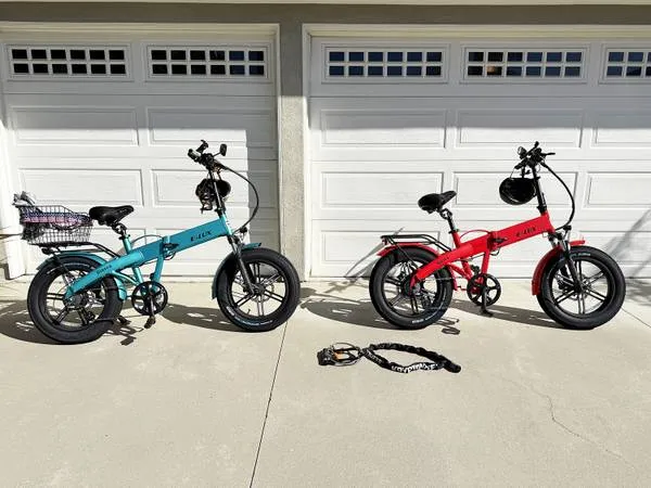 Selling 2 - Elux Sierra GT Folding Fat Tire Electric Bicycles + Accessories (Prefer to sell together-can possibly discuss selling separate) $2,795 full package. (please read all info below). CASH ONLY SALE. Please contact me for questions via Text to my number in contact info or send me email. These bikes are basically like new and you are getting an excellent deal much lower than we paid for them. Willing to negotiate fair offers. • Had them for about 18 months and only rode them like 5 times. • Super low milage and in great condition by keeping in garage. •Both come with: helmets, 2 locks (1 super heavy duty), phone holders on handle bars • One has a basket on back and a drink holder. • Both bikes can be folded down and able to put in some cars that they can fit in. • All other info in photos with details and specifications provided.