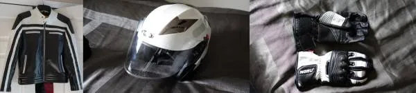 3 piece Motorcycle riding package deal. Includes custom motorcycle jacket, size 38. Black and white. Thick cowhide leather, left hand YKK zippers - New condition with no visible wear. Mans size small or 38. Yema size small helmet 55-56 cmin mint super low use condition. Noru size medium gloves, new and unworn. AN ACTIVE POST MEANS ITS FOR SALE DO NOT CALL MORE THAN 1 HOUR IN ADVANCE OF BEING ABLE TO PICK UP No Email No text Call 586-825-3000