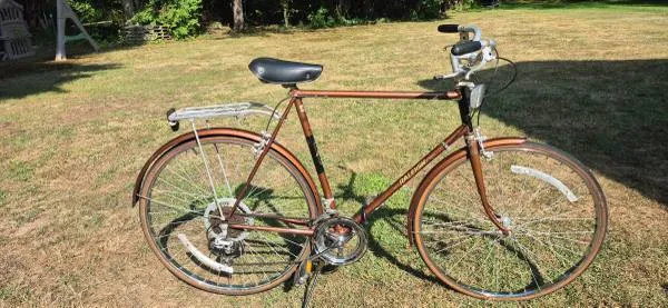 27 tires. 10 speed with 25 setup. Kickstand, front and rear fenders, Original Brooks suspension saddle/seat, reflectors, Suntour derailleurs with stem shifters, rear spring loaded utility rack, caliper brakes. In excellent condition. Clean bike with no rust. Brakes are excellent and all gears work. Ready to ride. Asking only $130 with regular seat or $170 with Brooks. Call or text 508-809-0659 same bike Sells for $250 and more on ebay