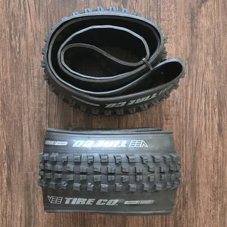 These tires came with a bike I purchased last year. They have never been used. Tubeless compatible. Vee Tire Branded (not sure who the actual manufacturer is or what plant they come from). For those that want to see an er at the end of every tire size, these are for a 29er. The model is listed below. A bunch of acronyms. I dont know what they stand for. I did see some reviews and basically what youd be getting is a tire that has a massive amount of grip so they would be good for riding at Brushy Creek for example. Quarter notch, double down, rim loop... If youre in a hurry to finish with that ride for whatever reason, these may not be the best tires for you according to the reviews. If youre out there for the exercise and views and you dont like washing out on berms or having your rear tire slip when youre in your lowest gear and climbing, these are probably going to be the tires for you. My bike religion will only allow me to ride tan wall tires so, I cant use these. View the pics. Thank you