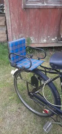 Child seat attachment for bicycle from early 1970 s English bicycle. Seat and cushion both in excellent condition. Seat and arms fold down when not being used. Foot pegs and hardware all accounted for. Complete seat and attachment setup. Many do not have cushion and sell for $125 and more. Asking only $60. Call or text 508-809-0659