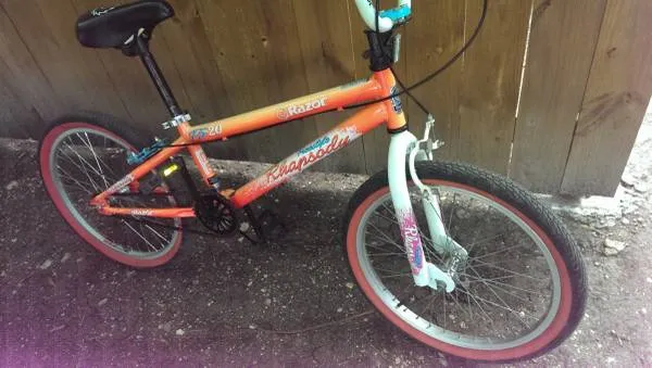 Selling one GIRLS 20 INCH RAZOR/RHAPSODY BMX FREESTYLE BIKE. The bike has the original factory paint, that is a peach and cream color. The rims are Weinmann Aluminum Alloy rims with the original 20X 1.95 FREESTYLE tires in great condition, with lots of tread left. The bike has the quick release seat adjustment. The bike has a freewheel on the rear, so theres no brakes on the pedals. Only front and rear hand brakes on the handle bars. The original factory seat is nicely padded, but it does have a small cut on it. The bike runs good, its ready to ride. The bike is pre-owned in excellent condition. Asking price is $75.00. If interested, please call or text for more information. Thanks for looking.