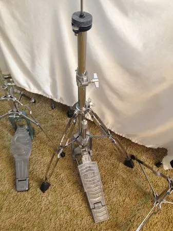 Drum kit and cymbal stands for sale. Also bass drum pedals. Mostly 60s, 70s, and 80s. Mostly Tama and Slingerland from 60s to 80s. ================= Hi Hat stands - Slingerland flat base early 1960s - $45. Slingerland Buddy Rich dynamo early 1970s sturdy and works excellent...$65. Tama late 1970s Titan with the earlier foot board, original parts incl clutch.....$55. Bass drum pedals: Yamaha 1980s Recording Series 900 single post pedal. Probably the best rock pedal of the 1980s - very nice complete original condition - ($55). Slingerland 1970s Yellow Jacket direct drive pedal $45. Tama early 1980s Imperialstar in the Rogers style with the inverted spring ($30), Pearl 1980s knock-off pedal - rugged and well made - missing the hoop clamping mechanism - $15. Cymbal stands: Several vintage 60s/70s Slingerland rocket wide-base & short-base Buddy Rich and flat base stands: $50-$60. 2 Pearl 70s style straight stands - $25 each. Camco 1960s flat base stand - pretty clean - $65 (last photos). Slingerland flat base stands 1960s - $50 Snare stand: Slingerland 1970s rocket style Buddy Rich model - $45. Orchestra Bells or Traps Table - Slingerland 60s/70s - excellent condition - $35. Phone calls or Email messages only.