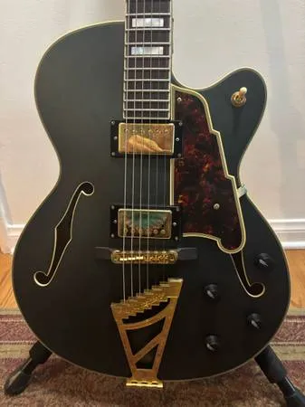 DAngelico Deluxe DH Hollow Body Electric Guitar $750 FIRM Like new, with Original Hard Case (OHC). The DAngelico Deluxe DH is a single-cutaway hollowbody electric guitar known for its versatility and classic tone. It features premium components and Art Deco-inspired appointments, making it suitable for a variety of genres, from jazz to rock. Body: A 16-inch-wide, 2.8-inch-deep hollow body with a single cutaway design. It is constructed with a laminated spruce top and laminated flamed maple back and sides. Neck and fingerboard: Features a slim, three-piece maple/walnut/maple C-shaped neck with a 25.5-inch scale length. The fingerboard is typically ebony or rosewood with 22 medium jumbo Jescar frets and pearl block inlays. Pickups: Equipped with two Seymour Duncan DA-59 humbuckers, specifically designed for DAngelico. A six-way toggle switch offers versatile tonal options, including humbucker and single-coil settings. Hardware: Includes gold-plated hardware, a pinned rosewood-base roller tune-o-matic bridge, a DAngelico Stairstep trapeze tailpiece, and Grover Super Rotomatic locking tuners. Aesthetics: Known for its luxurious and vintage appearance, with multi-ply binding on the body, neck, headstock, and f-holes. The distinctive Art Deco-style skyscraper truss rod cover and stairstep tailpiece are signature features. Case: Sold with a deluxe hardshell case Deluxe DH Matte Midnight