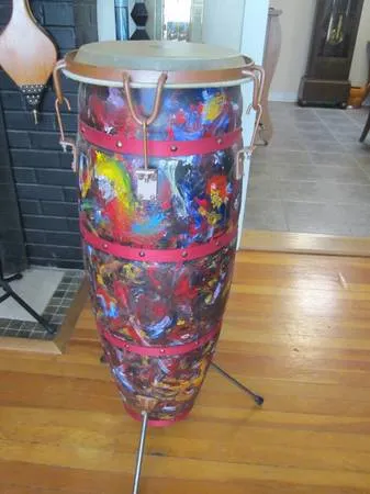 This quality conga features a LP rawhide Head, it sounds good and is in excellent condition. It has been custom adorned by a Latino graffiti artist from LA according to previous owner ( I wish I had written the artists name down). There are musical and life scenes painted all around the exterior of the drum which are both beautiful and interesting to look at. The drum is approx 40”T as pictured, but has adjustable legs for height and tilt. The top of the drum is approx 13” in diameter overall. $165 For fastest response please call or text. !!! Emails MUST MUST include phone number!! Thanx