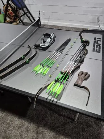 2025 Black Hunter Recurve. Has 60 pounds limbs on it. Have brand new set of 50 pound limbs. Both limb sets have limb savers and string silencers on them. Upgraded string to a fast strike flemish twist from TTT Archery. BOJAX string silencers. Limb quiver from Shatterproof Archery. 8 arrows. 340 spine. All arrows have lighted knock. Comes with 4 schwacker fixed broadheads. And have 650 grain inserts to have 150 grain up front. Arrow build is 467.8 grain. Come with a bear 3 finger leather glove. FIRM on price. Have around $650 in this build. Everything purchased after Sep 12025. Wounded 2 deer this year so I am sticking to my compound. Bow is quiet and fast and Light. Call or text Jim 573-631-0173