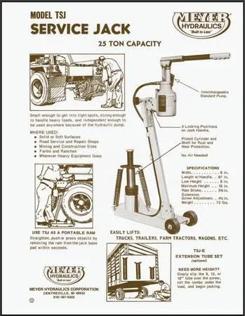 Professional-grade 25-ton hydraulic service jack made by Meyer Hydraulics in Centreville, Michigan. Meyer makes aircraft jacks and stands now so they are used to precision and heavy duty. This is the real USA-made heavy steel shop jack, not a big box store toy. Pumps smooth, lifts strong, no leaks, extension screw works perfect. Features: • 25-Ton capacity • USA-made • Heavy steel construction • Rolls easily, handle locks correctly • Tested and fully functional • Great for tractors, trucks, trailers, equipment, and shop use Specs: • Low height: 9 in • Max height: 19 in • Ram stroke: 5.5 in • Screw extension: 4.25 in • Weight: ~72 lbs • Model: TS25CORP 559 Condition: Clean, solid, dependable. Normal age wear but works exactly like it should. And since I didn’t have a gravel truck sitting around to test it, I just lifted the front of my Ford and called it good. Located in Nashville, IN • Local pickup / Meet Up / Delivery • Can deliver within ~45 minutes for a small fee