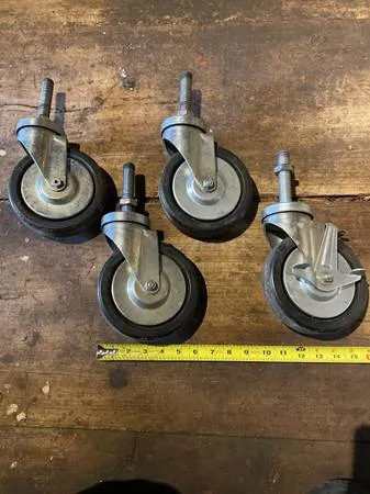 Very nice swivel castors with 4” long 5/8” diameter stem. Brake on one wheel. Includes 4 threaded 5” x 6” mounting flanges. Phone calls only, please. Texts will be ignored!