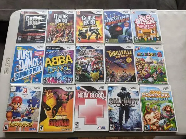 Hi. I have the following Nintendo Wii games on sale. They are my part of my game collections over the years. All in like new condition with original inserts and booklets. Cash only 1. Guitar hero world tour - $70 2. Mario Sonic at the Olympic - $50 3. Just dance summer party - $40 4. Harvey birdman - $30 5. Guitar hero 5 - $35 SOLD 6. Guitar hero Aerosmith - $40 7. Super monkey ball - $15 8. Call of duty world at war - $25 9. Trauma center new blood - $30 10. Mario party 8 - $50 11. Thriville - $30 12. Big brain academy - $20 13. AMF bowling - $25 14. Super smash bros - $50 15. Abba dance - $30
