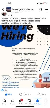 Looking for a female cashier to work at a car wash! Strong sales experience Great customer service Self motivated Must be able to work weekends from 8-6 pm Must be able to work major holidays 40 hrs guaranteed Please contact Silvia at 323-377-7941 Business hrs only please from 8 am-6 pm