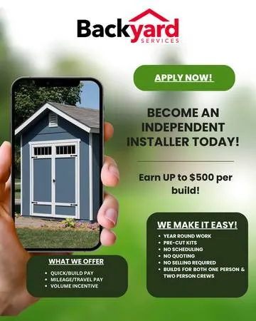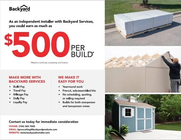 Backyard Products, America’s 1 Backyard Builder for over 40 years, is seeking dependable builders with carpentry/building experience to install sheds in our customers backyards! All of our kits have pre-packaged and pre-cut materials for easy assembly and installation. Most kits can be fully built by 1 builder in 1 day! We welcome building partners that are induvial builders and also builders with helpers/teams. You get to be your own boss as a 1099 independent contractor. You can take advantage of a flexible schedule that you choose! We offer competitive pay along with build bonuses. Bonuses are structured to reward higher output builders. Our precut kits go up fast, and easy. No wasted time running down job leads and estimating jobs that don’t sell! Schedules are created to fit your appetite for work. We pay daily by Direct Deposit! No waiting for or hunting down your pay! We require: • Building/Carpentry experience • Good communication skills • Excellent customer service skills • Ability to work in all temperature extremes • Reliable transportation • Nail gunsframing nailer and roofing nailer • Air compressor & hoses • Impact driver & drill • Hand toolshammer, tape measure, square, level etc. • Ladder tall enough to get on the roof • Automobile and General Liability insuranceboth have to meet our minimum coverage requirements Apply here to get started today! https://hcm.paycor.com/l/r/4528 EA 71 If you have any additional questions, please call/text 734-365-7000. . . . . shed, sheds, wood shed, wood sheds, wood barns, wooden shed, wooden sheds, wooden barn, wooden barns, barn, barns, play, play set, playsets, play systems, roofer, roofers, framer, framers, construction, assembly, assembler, build, builder, builders, building, install, installing, installer, installers, carpenter, carpenters, carpentry, carpentry work, work, working, worked, worker, full-time, full time work, part-time, part time work, business, business opportunity, independent, sub, subs, subcontractor, subcontract, subcontracting, national, retail, retailer, retailers, local, locally, crew, crews, flexible, flex, pay, paid, m 1 y, bonus, competitive, tuff shed, tough shed, schedule, service, services, skill, skills, skill set, skillset, experience, experienced, tool, tools, equipment, truck, trucks, earn, earning, customer, customers, customer service, backyard, backyards, kit, kits, manufacture, manufactured, manufacturer, season, seasonal, partner, project, projects, industry, leader, qualified, professional, professionals, team, teams, ne 2 rk, factory, factories, materials, veteran, vet, military, usmc, usn, usaf, army, marines, navy, air force, quick pay, daily pay