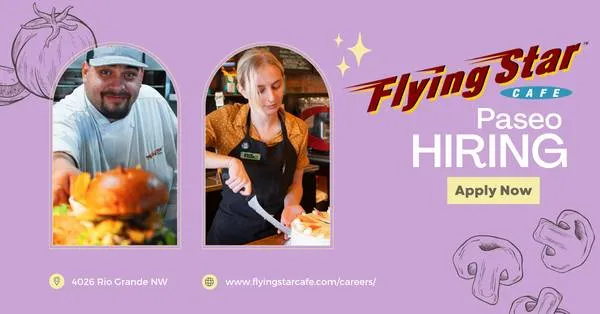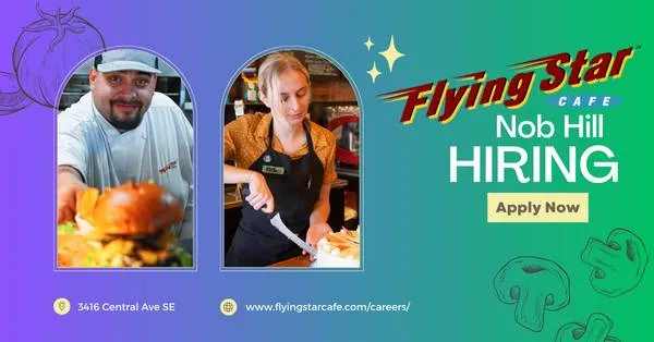 🚀 Join the Dynamo Team at Flying Star Café in Nob Hill! 🌟 Looking for a fast-paced, fun, and friendly place to work? Flying Star Café in Nob Hill is on the hunt for hard-working, friendly folks to join our family! No restaurant experience? No problem — well train YOU! If youre motivated, reliable, and ready to learn, we want to meet you. Part-time and full-time hours available. Why You’ll Love It Here: High-energy, never-a-dull-moment environment Great coworkers (and lifelong friends!) Opportunities to grow – every position has a path upward! Supportive team and a place where your work is valued Were hiring for all front-of-house and back-of-house positions. Part-time and full-time hours available. *Busser/Dishwasher: $7.50/hour + tips plus station certifications. *Counter staff start at $8/hour plus amazing tips plus station certifications *Line cooks make between $15/hour and $17/hour DOE plus station certifications! 🚀 The sky is the limit with us — come grow your career at Flying Star Café! Check our website for details and apply online today @ www.flyingstarcafe.com/careers/ The Perks: *Paid Time Off *Employee recognition program *Earn more cash when you certify on stations. *Free and Discounted Meals *Alcohol License reimbursement *Slip Safe Shoe reimbursement *Food Handler reimbursement *Dental, Vision and Accident plans
