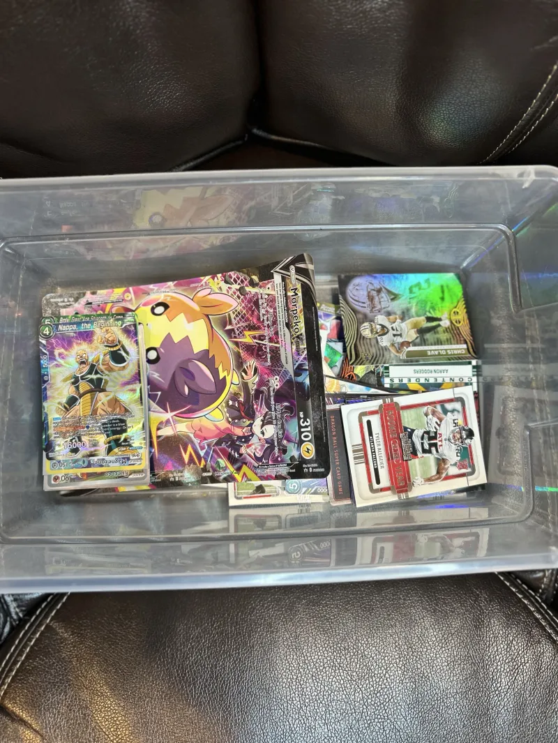 Mixed trading card lot in a plastic container. About 50 cards total (didn’t count exactly). Includes: • Pokémon, Football, and Dragon Ball Z cards • Fuecoco PAL EN 201/193 (sleeved, good condition) • Large Morpeko V-Union promo card • 100 card sleeves (sealed) • Top loader (sealed) Some holo cards have curving from not being stored flat. No attempt to hide that—priced accordingly. Several Pokémon cards (including Fuecoco) were kept in sleeves, so they’re in solid shape.