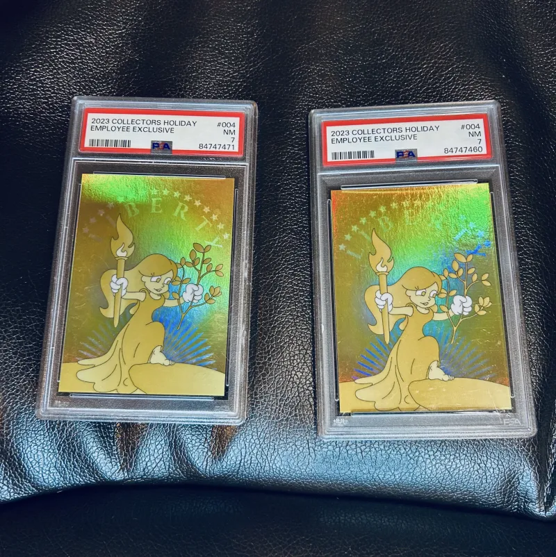 Rare PSA employee-exclusive holo card from the 2023 Collectors Holiday set. This card was ONLY given to PSA employees — never sold to the public. • PSA Graded: 7 (NM) • 2023 Employee Exclusive – Card #004 • Holographic Liberty Girl Design • Not available in retail packs • Short-run internal holiday release I personally received these while working at PSA in Jersey City. I have 2 copies available, both graded PSA 7. No idea why they graded at 7 — they were gifted already slabbed. These are
