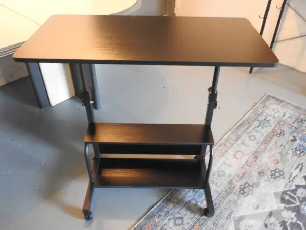 Two stand up desks on wheels similar in style and espresso colored. Desks can be lowered or raised (non-electronically). The table part of the desks for the two of them measures approx. 32 X 16 Quality ranges to New to Like New/Excellent. Selling together for $40.00 or each separately for $25.00 Please Call, I will not respond to texts.