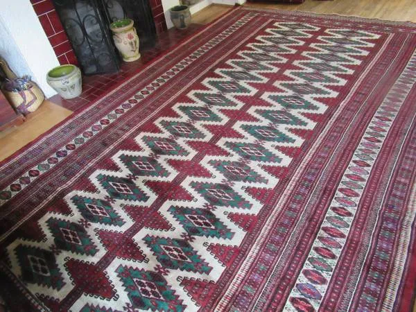 Handwoven Rug from the Yomat Tribe in the Turkestan Region – Circa 1980 Geometric Rug with Repeating Distinct Guls and Minor Guls Complemented with Ornate Minor Borders Each Having Its Own Design Cream Field with Rich Red Borders and Shamrock Green Guls Very Good Condition – Tight Weave. Good Edges, Pile, and Colors. Slight Patina Call/Text is Best or….. Google staffordsrugs Code: TSYMT75X115