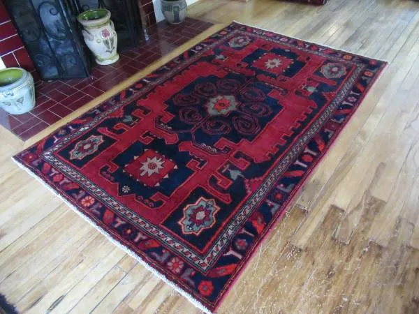 Handwoven Rug from the Village of Zanjan in the NW Region of Iran – Circa 1980 Geometric Rug with a Central Medallion Complemented with Minor Medallions on Both Ends and In Each of the Corner Brackets Rich Red Field with Midnight Blue in the Medallions, Brackets and Border, as well as a Muted Teal In the Bracket Medallions and the Minor Border Excellent Condition - Good Edges, Pile, and Colors. No Significant Wear Call/Text is Best or….. Google staffordsrugs Code: PRZJN4X6