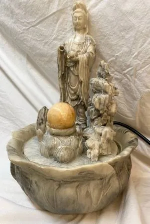 A thing of beauty is a joy forever. From Grammas Collection, we have a vintage, very beautiful Kuan Yin Table Top Indoor Fountain. Kwan Yin, also known as Guanyin or Quan Yin, is a Bodhisattva and the goddess of compassion in Buddhism. A Bodhisattva is an enlightened being who agrees to be born eternally until all souls are liberated. This outstanding fountain is beautiful and evokes a sense of serenity. This Spiritual Water Fountain is a work of art, cast in stone resin and volcanic sand. Guan Yin stands upright, as if pouring Her blessings on a globe that spins as the water fountain runs. Our best guess is that the globe is made of carnelian (more on carnelian benefits below). The fountain adds a beautiful sound of cascading water which promotes relaxation, calming the mind, and easing the senses. The entire fountain is a lotus flower, an emblem symbolizing purity of body and mind, and is often associated with rebirth, birth, and reincarnation. In Hinduism and Buddhism, the lotus represents awakening to the spiritual reality of life. In Buddhism, the lotus symbolizes self-awareness and the opening of the mind to the world around us. The fountain is in perfect form. The motor runs perfectly, all parts are in perfect form. All you have to do is plug the fountain in. Comes from a non-smoking facility with no pets nor kids. We take very good care of our stuff and pass our high standards to your benefit. This fountain is clean and ready to grace your home altar, shop or store. 10.5 wide 10.5 deep 15 tall No nicks, no gouges, no wobble, nothing to repair. We do not know how old it is but it in perfect condition and in good care may last several more decades! Flawless. If you are accustomed to the best, this table top fountain is for you! Carnelian is a variety of Chalcedony. Carnelian is considered a lucky stone, and is said to attract prosperity, new resources, and good luck. Physically, Carnelian is said to improve circulation, metabolism, and energy levels. It may also help with digestion and relieve abdominal pain. Emotional healing: Carnelian is said to promote emotional balance and stability, and help people overcome fear, anger, and negative emotions. It may also help with emotional release and improve the ability to embrace joy and passion. Spiritual healing: Carnelian may enhance spiritual growth and deepen ones connection with inner self and higher realms. Creatively, Carnelian may stimulate imagination and encourage artistic expression and help break through creative blocks and open new perspectives. Cash $198. FIRM. Please go online and compare prices to find out what a deal you are getting here. We do not deal with money orders or checks. We do not deal with money orders or checks. We do not deal with money orders or checks. Thank you. If the ad is up, it is still available. If the ad is up, it is still available. If the ad is up, it is still available. If you wish to find more items I sell please search Grammas Collections. Cut and paste Grammas collection into the CL search box.Thanks Tag words: Grammas collection side table accent table Oriental Chinese Japanese shelf cabinet curio display fixture plant stand store supplies pop up trade show display floor standing metal display rack shop organizer tool shed cabinet shelf shelving unit pantry organizer storage solutions garage organizer entertainment cabinet mirror vanity nightstand, side table, small table, tiny table small spaces bedroom living room beauty parlor island work table shelving system shelf organizer storage rack Display & Store Fixtures Shelving farm, garden, patio, indoor plant, patio estuary decor decorative design designer interior exterior sun sunny lush verdant home, remodel, designs, homes, house, landscape, landscapers, gardeners, gardening, gardener, farms, buildings, apartments, homes, remodeling, gift, office, home decor, redecorating, plant, flower, potted, bloom, Altar Fountain, Garden Fountain, Spiritual Water Fountain, Sculpture Water Fountain