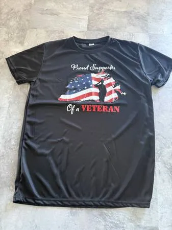 Proud Supporter Of A Veteran T-Shirt - Size Large - Soldier Veterans Day Proud Tee. Under the arm measurements are 21 and Shoulder to bottom of hem is 28. Please check you measurements before you buy. Comes from a Smoke and Pet Free Environment. What you see in the photos is what you get. See photos for best details and use photos as part of its description. If interested please call or text Four,Zero,Eight, Four,ZeroSix, Seven,Three,Two,One to view, buy and pick up. This is located in North San Jose off North First Street and Nicholson Lane. Thanks for looking and please check out the rest of my ads, Margie