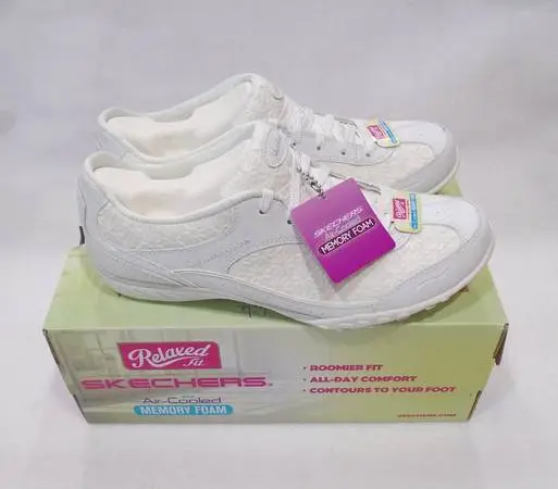 SKECHERS 9 M white Relaxed Fit with Air-Cooled Memory Foam embossed floral - NIB Brand new in the box, the Skechers Relaxed Fit walking shoe is incredibly lightw 8 and features a cushi 1 d Skechers Memory Foam™ insole. This easy-on sneaker features a roomier fit that contours to your foot for all-day comfort - no matter what you have planned! $35. cash only. Please call or text Janna 970-667-1765 unable to answer emails, sorry Located 1 mile from the north Loveland Walmart at H...