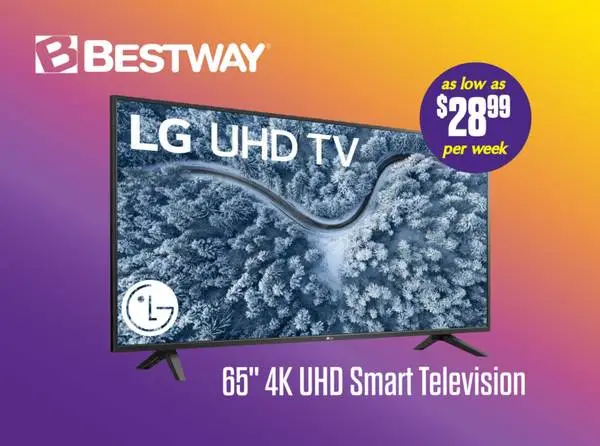 New TV from LG with weekly price Enjoy the best of LG sound and picture quality in a large 65 inch flat screen format. The upgraded Smart TV features of WebOS lets you use any app or website directly from the TV with your remote. Get it now from Bestway 336-967-1904