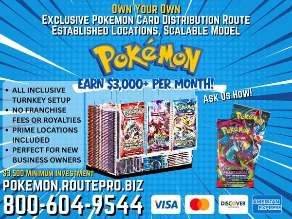 🔥 Start a Pokémon Card Income Stream — $2,000$5,000/Month PotentialNo Experience Needed🔥 Looking to tap into 1 of the hottest collectibles markets in the world? Pokémon cards sell themselves — and demand has never been higher. We give you EVERYTHING you need to start earning fast, even if you’ve never sold cards before. This is simple, proven, and built around a brand people already love. Turnkey setup , Proven business format, Inventory and Distribution Locations Included 💥 Why This Pokémon Opportunity Is DIFFERENT✔ Backed by a long-standing, proven collectibles market ✔ Pokémon is the 1 trading card brand worldwide ✔ Cards are in constant demand with built-in repeat buyers ✔ Limited-access product supply — not available everywhere ✔ We’ve already d 1 the sourcing and setup for you If you want a product that people actively hunt for, this is it. ✅ Turnkey Setup — We Handle the Heavy Lifting • Authentic, high-demand Pokémon card inventory • Product mixes designed to sell fastcollectible packs and cards • Simple setup with clear guidance • Strong margins on every sale • No franchise fees, NO royalties — you keep 100 of the profit • Ongoing support to help you scale 📈 Start Earning FAST • Get up and running in as little as 23 weeks • Minimal time required each week • Perfect for beginners, side hustlers, or full-time sellers • Easy to scale as demand grows • Availability is LIMITED — inventory access is filling up quickly Pokémon cards aren’t a trend — they’re a global obsession. When access is g 1, it’s g 1. 🚨 TAKE ACTION NOW — BEFORE THIS OPPORTUNITY SELLS OUT 🚨 📞 CALL FRANK: tel: 800-604-9544 🌐 VISIT US AT: www.pokemon.routepro.biz Key Words: vending route, vending machine business, vending business, vending machine route, vending machine franchise, vending machine opportunities, candy snack drink vending machine route, be your own boss, make m 1 y, passive income business, franchise opportunity, cheap franchises, business opportunity, home based business, investments opportunity, own your own business, routes for sale, m 1 y making opportunities, online business, vending snacks, business for sale, candy vending, vending locations, turnkey business opportunity, no franchise fees, low overhead business, cash business, vending route, vending snacks drinks soda, turnkey vending business, start a vending business, profitable route, work from home, vending cards kiosks, food carts trailers, food trucks, hot dog carts, vending mentor, vending expert, carpet cleaning business, entrepreneurship, absentee ownership business, vending machines with locations, low cost business, income opportunities, small business opportunities, franchise for sale, buy a vending business