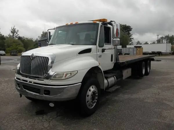 2007 International 4400 ramp truck or roll back truck with a DT 570 engine and a 10-speed standard transmission. Has 310456 miles on it. Has a lift axle that is controlled inside the cab. Has the wheel lift on the rear. Has a 28 Jerdan bed with a wood floor. I put a half inch cable on the winch. It has 295/75 R 22.5 front and rear tires. The wheel lift has 255/70 R 22.5 tires. I am the second owner of the truck. Bought the truck in May of 2017. I am the only person that drove it since I have owned it. It has always been kept in the garage when I wasnt using it and, in the winter, it was in the heated garage set at 60 degrees. The kingpins and complete tie rod assembly were d 12 years ago, new water pump last year, all ujoints and center bearings were replaced last year, new front shocks. oil and filters were changed every 10 to 11 thousand miles and was greased every 5 thousand miles. I put a new seat cushion on as seen in the picture. I updated to a heavier truck. For more info or pictures you can contact me by email or call me at 207-890-8654. Would consider trading toward a tri axle dump truck.
