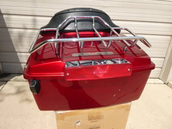For sale is a Beautiful Red Metallic Harley Davidson Tour Pack removed from a 1993 FLH Electra-Glide. This is in excellent condition the housing is perfect no cracks no broken parts, the backrest is also in excellent condition, includes some hardware to mount to your bike, I hooked the power cable to 12 volts and the side and rear light work. If interested call John @ 262-370-6363