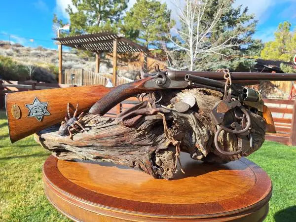 I have a 1 of a kindWells Fargo table top/desk top black powder weapons display. The original Belgium made Acme arms is a percussion blk. powder 12 guage, circa 1890 with inlaid agents badge and brass inventory I.D. tag number. The revolver is an early Uberti percussion blk. powder .44 caliber, with brass frame. both are securely mounted to a old and solid drif 2 od stump perfectly balanced and oiled for display. The piece has an antique leather coin pouch with 4 mounted authentic U.S. Morgan head silver dollars and fools gold nuggets for effects. Also vintage Wells Fargo functional ankle shackles with keys. Realistic Mexican orange legged tarantula for special effects. This a solid heavy unique special made piece for some 1 looking for the unexpected, this will be it. About 33 in length 12 tall. Will not ship but worth the trip to purchase. $1600, If your out of town its worth the drive. I have more 1 of a kind non-functioning antique original blk powder double barrel shotgun displays and in the form of lamps. I will list these as well. Roger, NO-NO-NO TEXT, calls only 775-232-5645