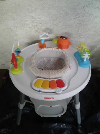 Available- Please do not ask as will not get answered. Ad will be removed when sold. **Pick-Up Only** Call Or Text (leave message as too much spam- Thanks!) Selling this interactive baby play center for $65 CASH Only (Firm) ---- Retail $149.99 plus tax -- 3 Stage Growth: a) Sit, swivel, bounce & play up to 25lbs; 360-degree rotating seat b) Cruise & interact; great for new walkers (not a walker) c) Play table (no chairs) --- Discovery Window lets baby see piano and their feet while playing. (1st picture piano comes off and can move to grey part underneath.) Musical, light-up piano with three ways to play: piano mode, song mode and motion sensor mode whole body approach to play and learning. --May want to machine washable Seat Cover Dimensions: 18.5 Inches (H) x 31 Inches (W) x 31 Inches (D). Suggested age 4 months and up. It is assembled.