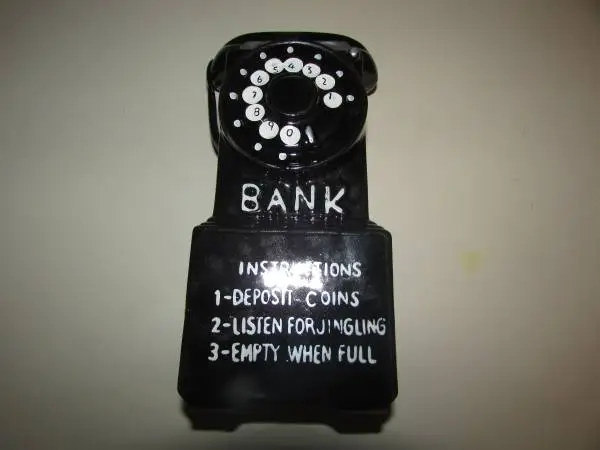 Vintage ceramic rotary pay phone coin bank. Measures 81/2 x 31/2. Missing the stopper plug but you can get 1 on-line or use tapeor whateverif you plan on using. Small chip on bottomsee picture. Very good shape. Im in West Irondequoit by the lake. Please call or text 585-431-2478 or use Craiglist mail.