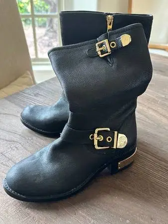 Very nice black leather Vince Camuto Mid-Calf boots. Maybe worn 1-2 times for a very short period of time, so basically new. Gold hardware accents, side buckles, zipper side. Ladies size 6 1/2. $20. cash - firm - must pick up in NW Norman