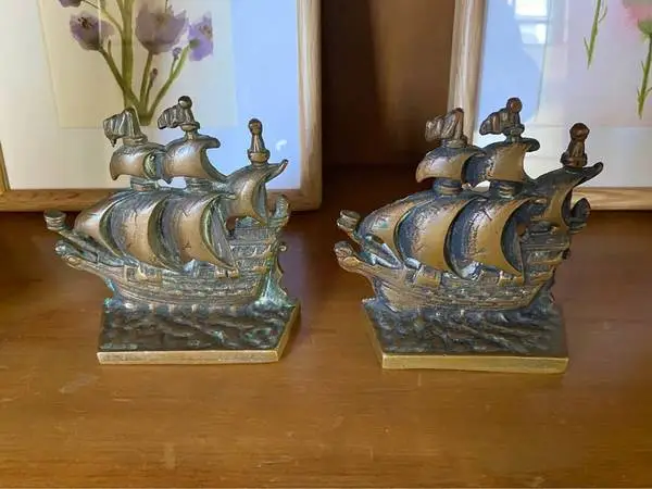 Beautiful and substantial antique 1920s heavy cast Elizabethan sailing ship bookends measure approximately 4 1/2 by 4 1/2” and weigh 1 1/2 lbs each. Each is marked A Galleon in the Time of Elizabeth 1558-1603. Gorgeous natural patina to these. Great set for office, den, etc. Perfect for the beach house or ideal gift. Cash and carry only. Sale final. Porch pickup. Text email or call!