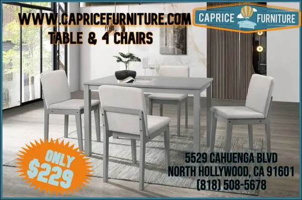 BRAND NEW 5 pc wood Dining set ! 50 off SALE $229 shop online at www.capricefurniture.COM Delivery & Financing Available Store location Caprice Furniture 818-508-5678 5529 Cahuenga North Hollywood 91601 Hours Mon-Sat 11-4 pm